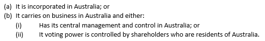 The current definition of resident company for income tax purposes is contained in Income Tax Assessment Act 1936 s6(1) and has been unchanged since its introduction in 1930.