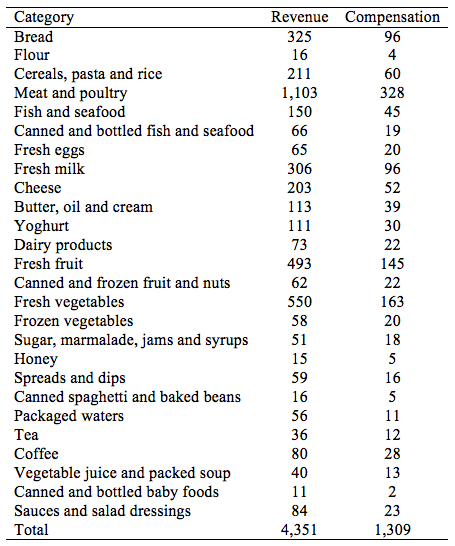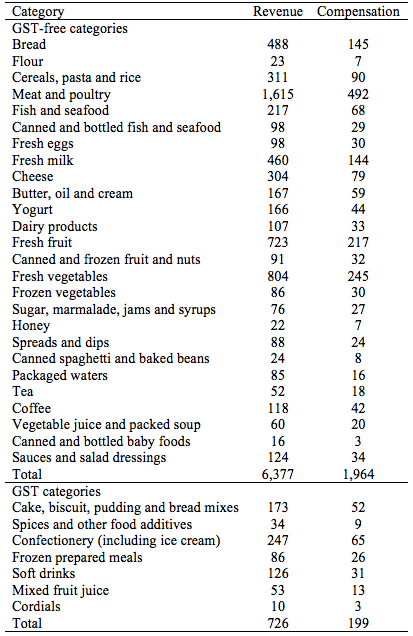 Table 1 below includes GST revenues and compensation payments that would result from compensating low-income households (the bottom 40% of the income distribution) for the loss in consumption as a result of broadening the tax base to include a particular food category but without increasing the tax rate. The numbers in Table 1 reveal that tax revenues would mainly come from broadening the tax base to meat and poultry ($1.1 billion), fresh vegetables ($550 million), fresh fruit ($493 million), bread ($325 million) and fresh milk ($306 million).