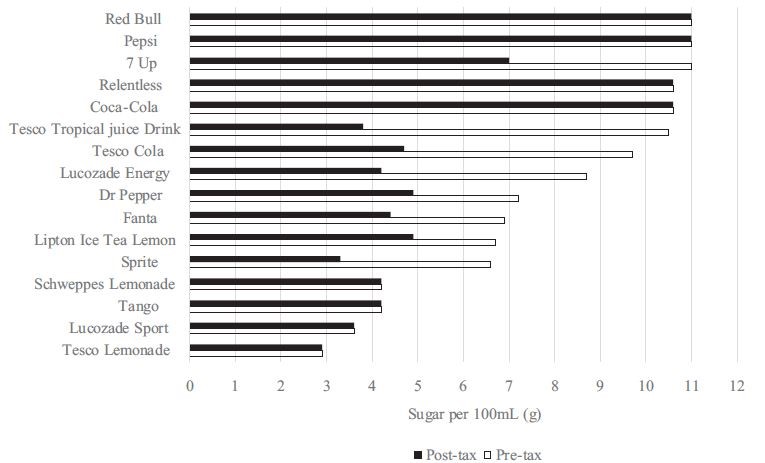 To illustrate, in 2018 the government of the UK introduced a progressive excise tax on manufacturers of SSBs, which had two values that were based on the sugar content of their branded SSBs. The response of manufacturers, having been given a two-year warning of the introduction, was to reduce the sugar content of most SSBs in order to reduce their tax burden. The effect has been that consumers can continue to consume their favourite brand and, for most brands, this would have reduced their sugar consumption even if it did not appreciably reduce the number of litres consumed.