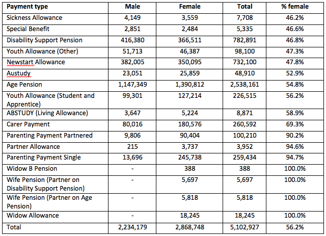 Table 1 shows the number and share of recipients by gender at 30 June 2016. Overall, 56.2% of all recipients of payments from the Department of Social Services were women. There are five payments where women are less than 50% of recipients – Sickness Allowance, special Benefit, Disability Support Pension, Youth allowance (Other) and Newstart Allowance, with women being a majority of the recipients of all other payments.