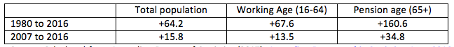 Since 1980, the total Australian population has grown by nearly two-thirds (1.8% per year) and the size of the working age population grew by a little more than this (1.9% per year); the population of age pension age has grown by just over 160% (4.5% per year). Since the GFC, the total population has grown by 15.8% (1.8% per year), the working age population by 13.5% (1.5% per year), and the pension age population by 34.8% (3.8% per year).