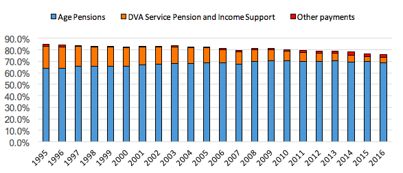 Note: The population is adjusted to exclude women aged 60-64 and receiving an age pension in all years and to include people aged 65 and over receiving DSP, Carers and other payments (all included in “Other”). Source: Department of Social Services, Income Support Customers: A Statistical Overview (various years); DSS Payment Demographic data https://data.gov.au/dataset/dss-payment-demographic-data. Numbers of DVA Service Pensioners and those receiving the Income Support Supplement are from DVA, Pensioner Summary Statistics, various years, https://www.dva.gov.au/about-dva/statistics-about-veteran-population; and Australian Bureau of Statistics (2017), Australian Demographic Statistics, June 2016, Cat. No. 3101.0.