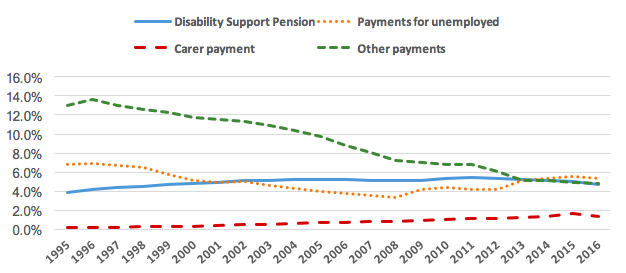 Source: Calculated from Department of Social Services, Income Support Customers: A statistical Overview (various years); DSS Payment Demographic data https://data.gov.au/dataset/dss-payment-demographic-data and Australian Bureau of Statistics (2017), Australian Demographic Statistics, June 2016, Cat. No. 3101.0