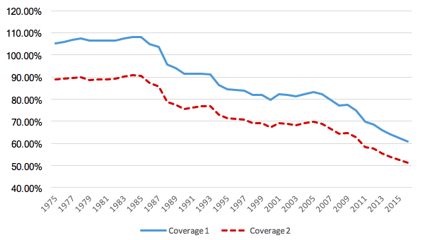 Up until 1987, when the Hawke government introduced an income test on Family Allowances, coverage was effectively universal. The introduction of the income test on payments saw coverage drop to between 70% and 80%. There was a relatively brief period of stability up until 2007, but since then coverage has again dropped due to the policy changes outlines above.