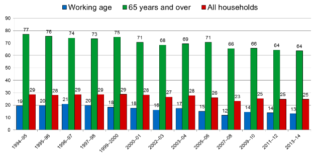 The proportion of households with a reference person aged 65 years and over for whom social security is the main income source has fallen from 77% to 64% over the two decades to 2014. The proportion of households with a working age head in the same situation has fallen by more than one-third, from 19% to 13%. The share of all households for whom social security is the main source of income has fallen less rapidly than either age group from 29% to 25%, because the reduction in age-specific rates of receipt has been partly offset by the ageing of the population.