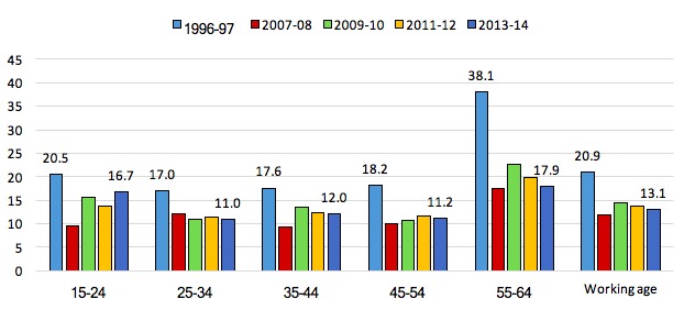 Figure 2 provides a more detailed disaggregation of reliance on social security payments by age of household head among the population of working age between 1996-97 and 2013-14. The most notable feature is that the decline in reliance on social security benefits has been greatest among households with a reference person aged 55 to 64 years, the pre-retirement age group. Reliance on social security has decreased least – by around one-fifth – among households with a reference person aged 15-24 years (but a minority of persons in this age group are heads of households). Among other working-age households, the share reliant on social security benefits has fallen by between one-third and two fifths.