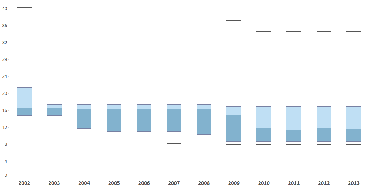 Figure 1 shows the box plot of the bilateral effective average tax rates over the 2002-2013 period. There is a general downward trend in the distribution of the effective tax rates. The median tax rate, for example, falls from 16.5 per cent in 2002 to 11.6 per cent in 2013.