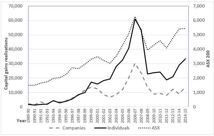 Figure 1. Individual and company capital gains realisations 1989-90 to 2014-15 (in millions of 2014 Dollars)