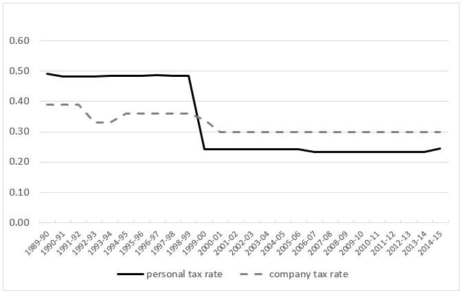 Figure 2. Individual and company tax rates on capital gains (%) 1989-90 to 2014-15