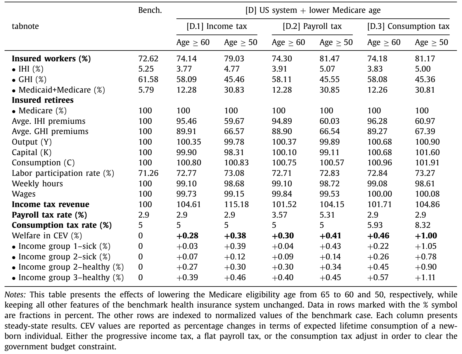 Our simulation shows that this Medicare expansion not only benefits the newly eligible workers but also younger workers. As the older cohort leaves the private health insurance pool and moves into Medicare, the remaining pool of individual with private health insurance becomes younger and their expected health expenditures decrease. As a result, private health insurance premiums decrease which directly benefits younger workers. This experiment demonstrates that the expansion of Medicare can generate welfare gains and improve social insurance at a moderate cost of higher taxes. Slightly larger welfare gains can be achieved by lowering the threshold further down to age 50 (see Table 1).