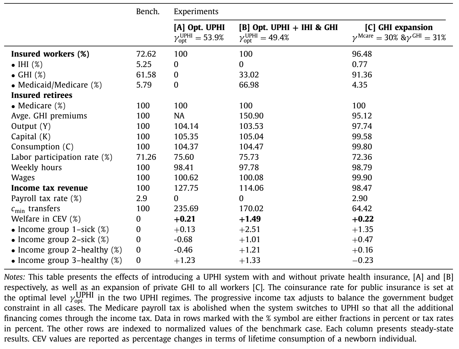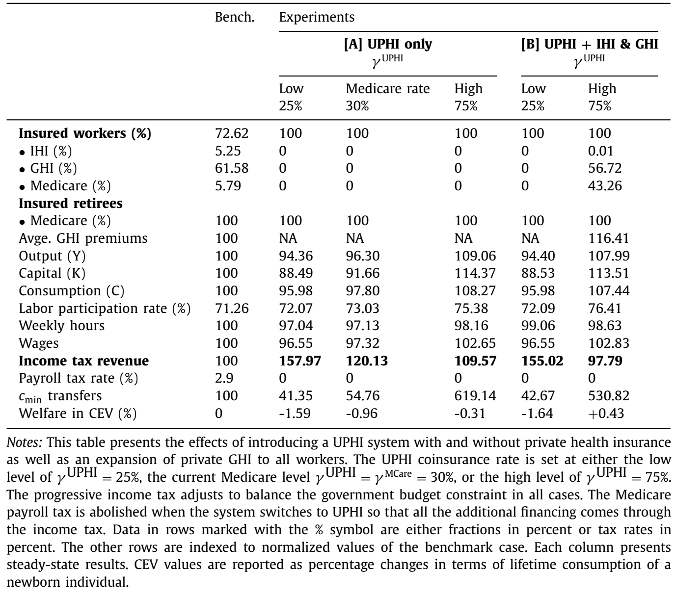 Overall, our results indicate that welfare losses caused by “bad” incentive effects dominate welfare gains due to “good” insurance and redistribution effects. This result strongly depends on the assumption that the generosity of the new UPHI system is similar to the current US Medicare system. This generosity is guided by the coinsurance rate (the fraction of the medical bill that the individual pays) which is set to 30 per cent.