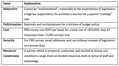 First, survey instruments are an inherently subjective measure. This is important to note because “doing a good job” will be very much a function of the expectations that legislators hold. Some legislators may set low expectations and be content with a passive “costings role”. Others may have higher expectations, particularly when they are in the opposition, expecting a more “activist” budget office that follows an open-publishing approach with strong ties to the media.